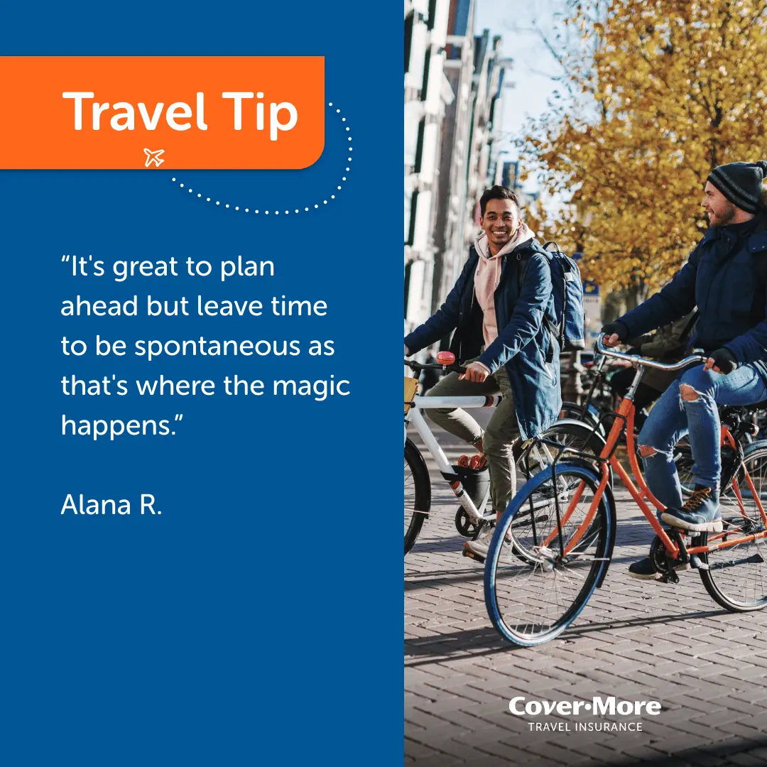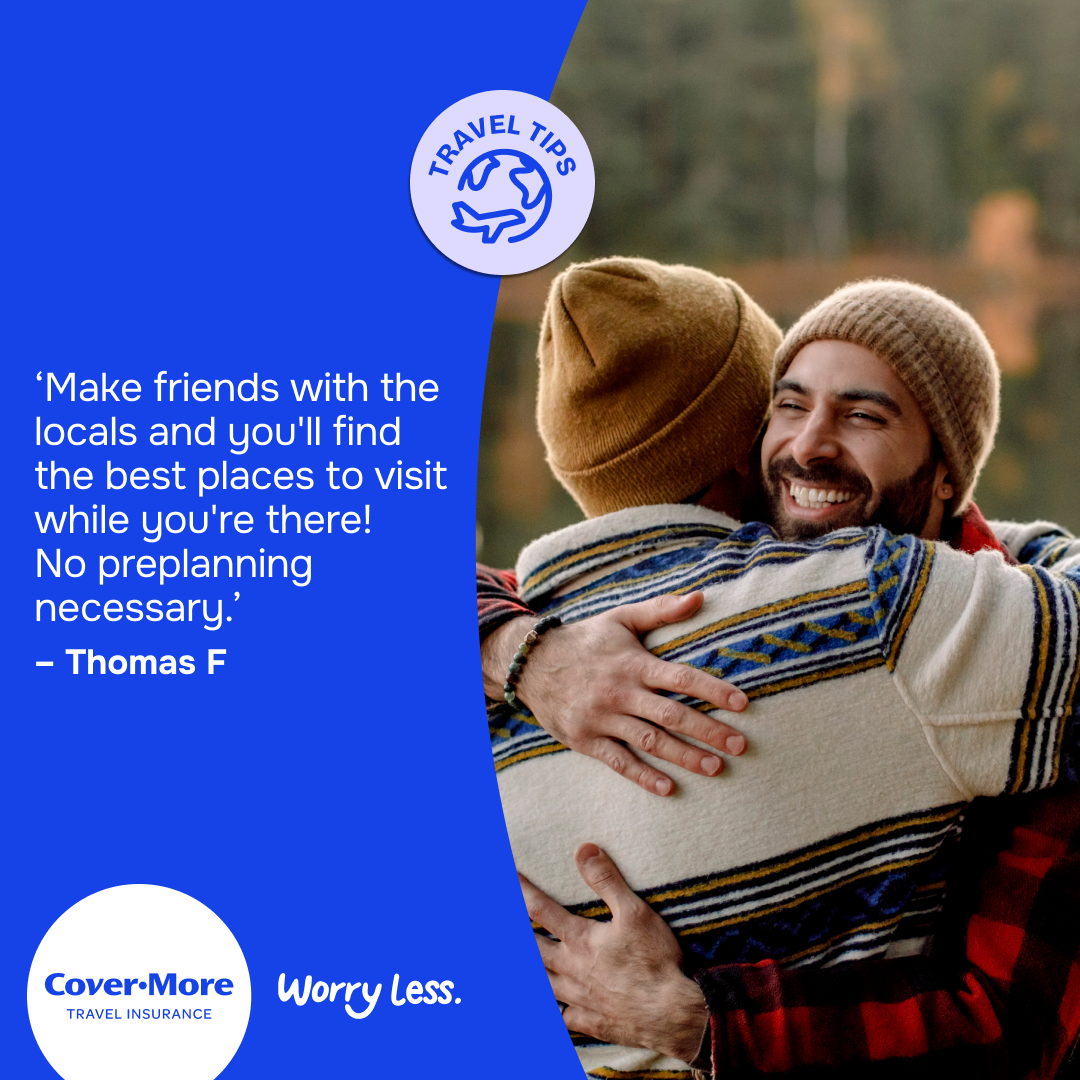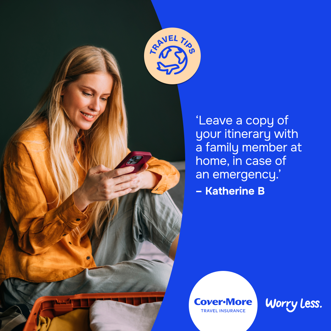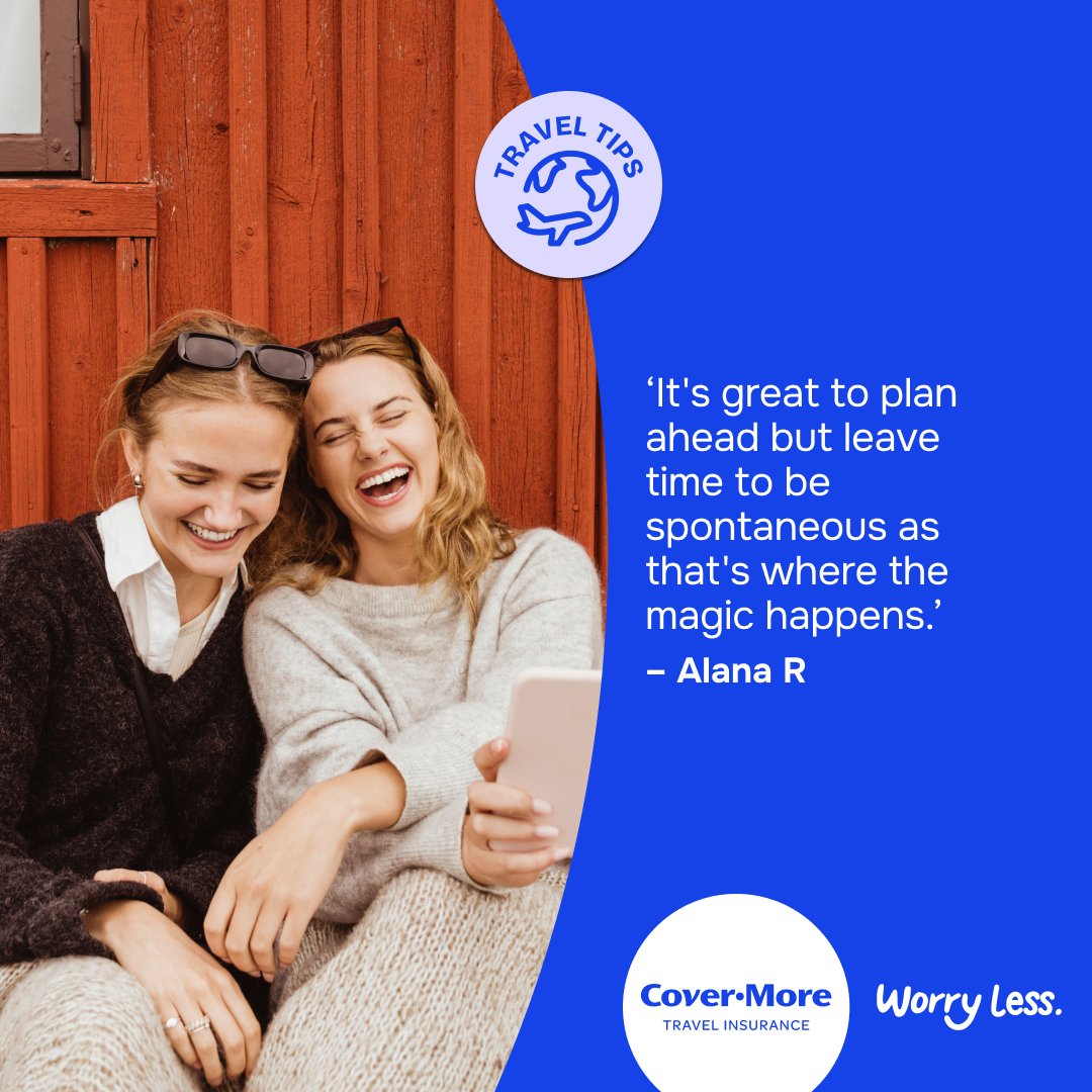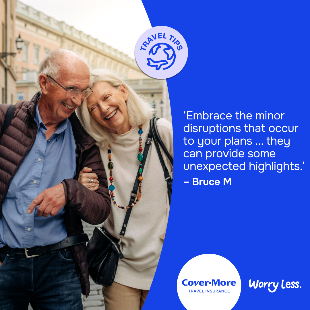 *The travel tips submitted as part of our Organised or Improvised campaign are the reported personal experiences of each individual and are provided for information purposes only. Cover-More does not guarantee or warrant the accuracy, completeness or validity of any of the stories. Any views, opinions, and positions expressed in the submissions and those providing comments are theirs alone and do not necessarily reflect those of Cover-More travel insurance. Travel tip submissions have been edited for grammar, spelling, syntax and punctuation errors only. Any advice provided is general advice only. For more information on Cover-More travel insurance, always read the Combined FSG/PDS and any other policy documentation to make sure that your chosen cover and policy is right for you.